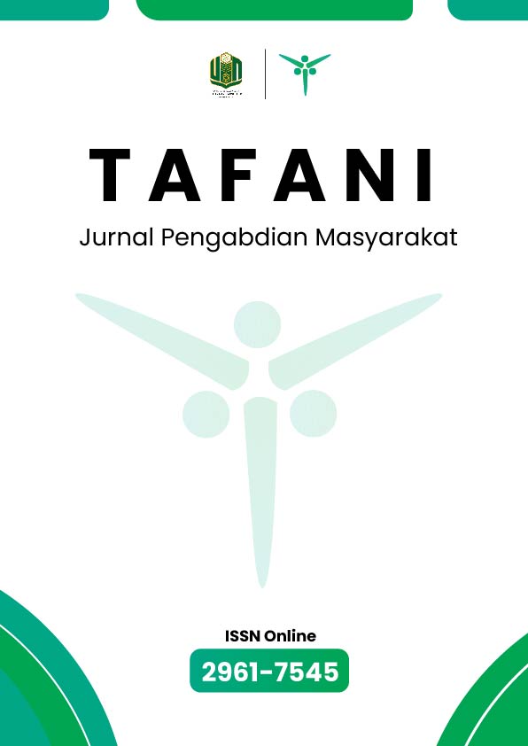 TAFANI: Jurnal Pengabdian Masyarakat, diterbitkan oleh Lembaga Penelitian dan Pengabdian Masyarakat LP2M UINSI Samarinda. Jurnal ini terbit dua kali setahun yaitu Juni dan Desember yang membahas praktik dan proses pengabdian masyarakat. TAFANI Jurnal Pengabdian Masyarakat menyediakan forum bagi akademisi dan praktisi untuk mengeksplorasi masalah dan merefleksikan praktik yang berkaitan dengan layanan pengabdian masyarakat. TAFANI: Jurnal Pengabdian Masyarakat merupakan jurnal online yang didedikasikan untuk publikasi artikel pengabdian masyarakat berkualitas tinggi yang berfokus pada implementasi layanan pengabdian kepada masyarakat.
