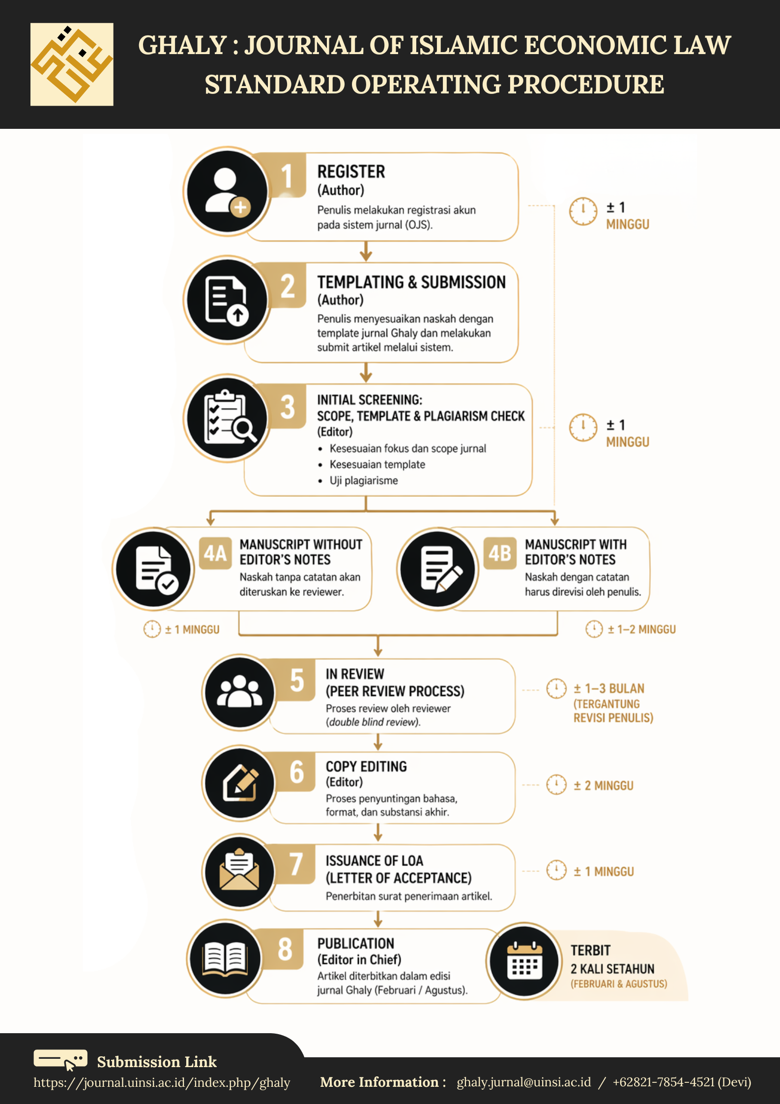 The editorial board of the Ghaly: Journal of Islamic Economic Law invites lecturers, students, scholars, and legal practitioners to contribute to the development of sharia economic law by submitting articles in the Ghaly: Journal of Islamic Economic Law. This journal is published twice annually, between February and August, after undergoing the review and editing procedures. The journal invites articles written in Bahasa, Arabic, and English that are the outcome of thesis research, theses, dissertations, lecturer research, and other study.